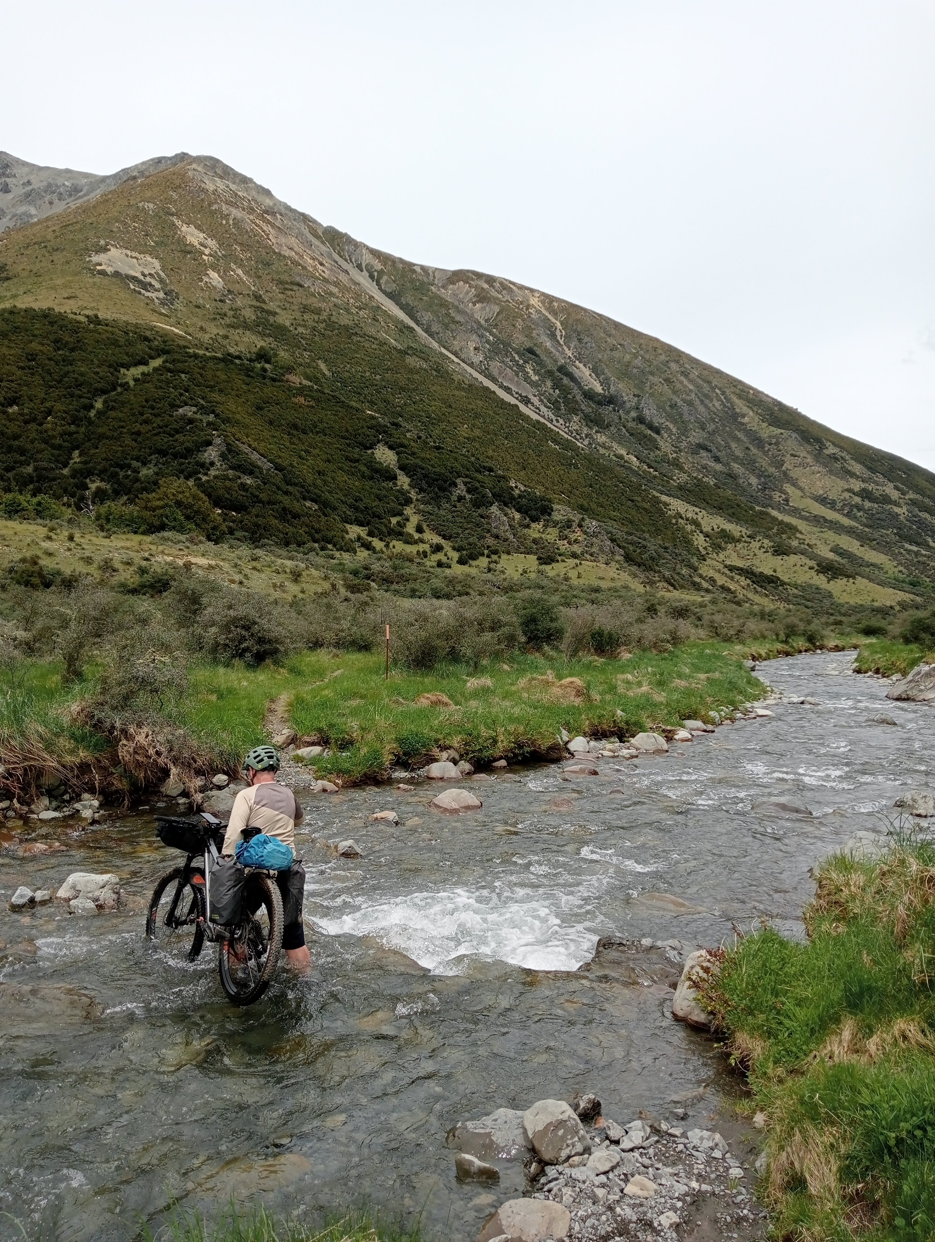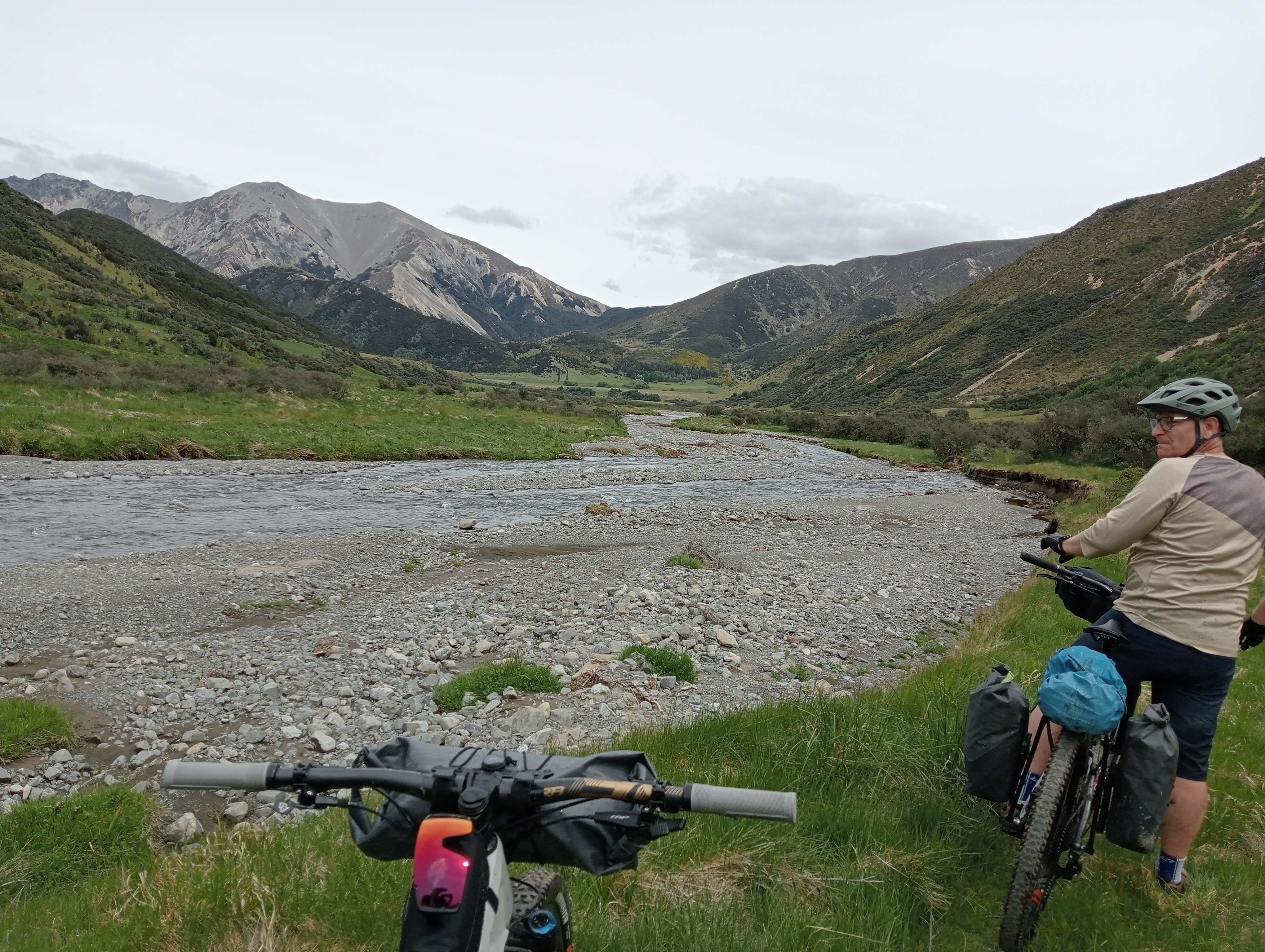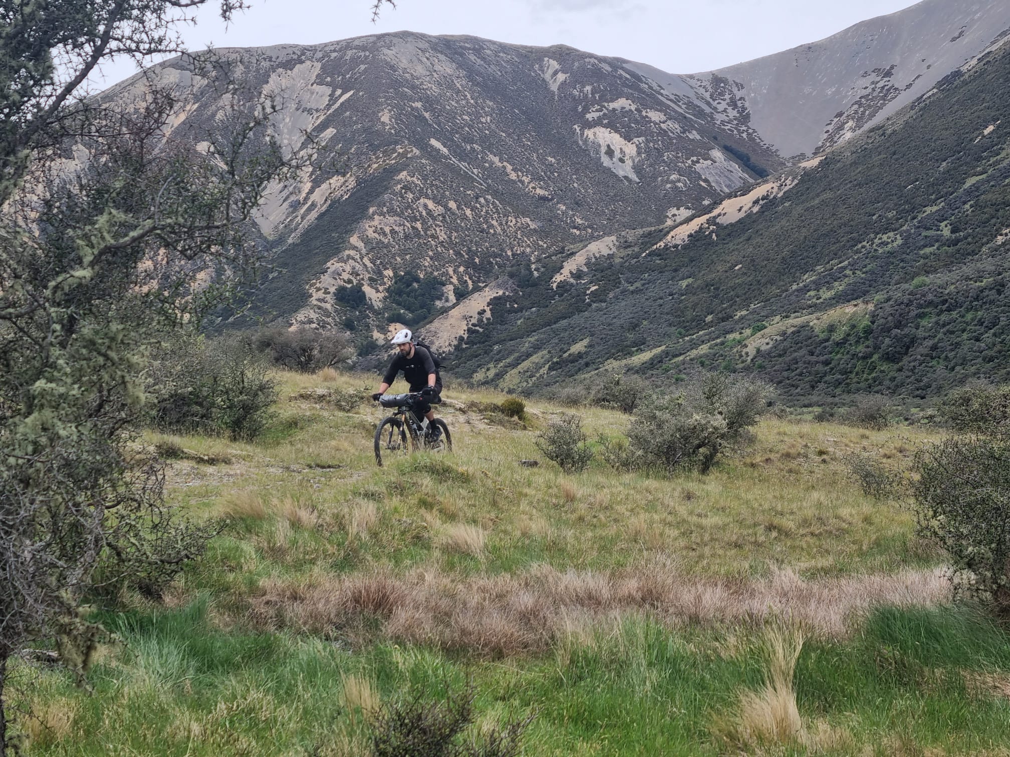 Soon, we reached Stanley Gates, where the river squeezes through a small gorge. A bypass route took us up through beech forest onto a bluffy face before descending on scree-like track back to the river. Next came the slog, more walking than biking up near Racecourse Stream, navigating water runoff before reaching the dry expanse of The Racecourse—a vast tussock flat locked between mountain ranges. Crossing it felt endless, pedalling over clumpy grass until we finally reached scrubby hills on the far side and looked back across the plain we had overcome.From there, we descended toward Charlies Saddle navigating a few sketchy spots while enjoying not having to do too much pedalling.