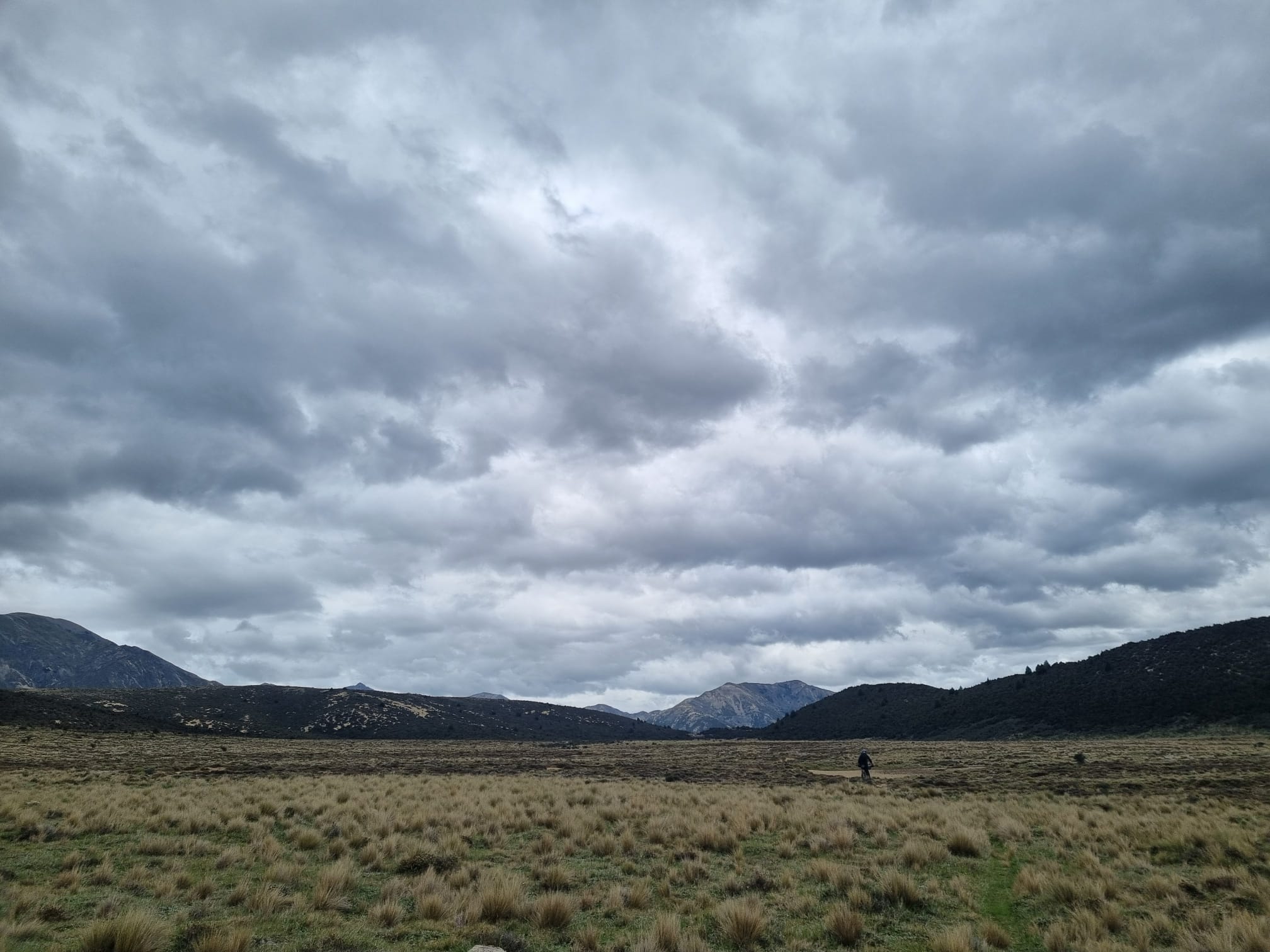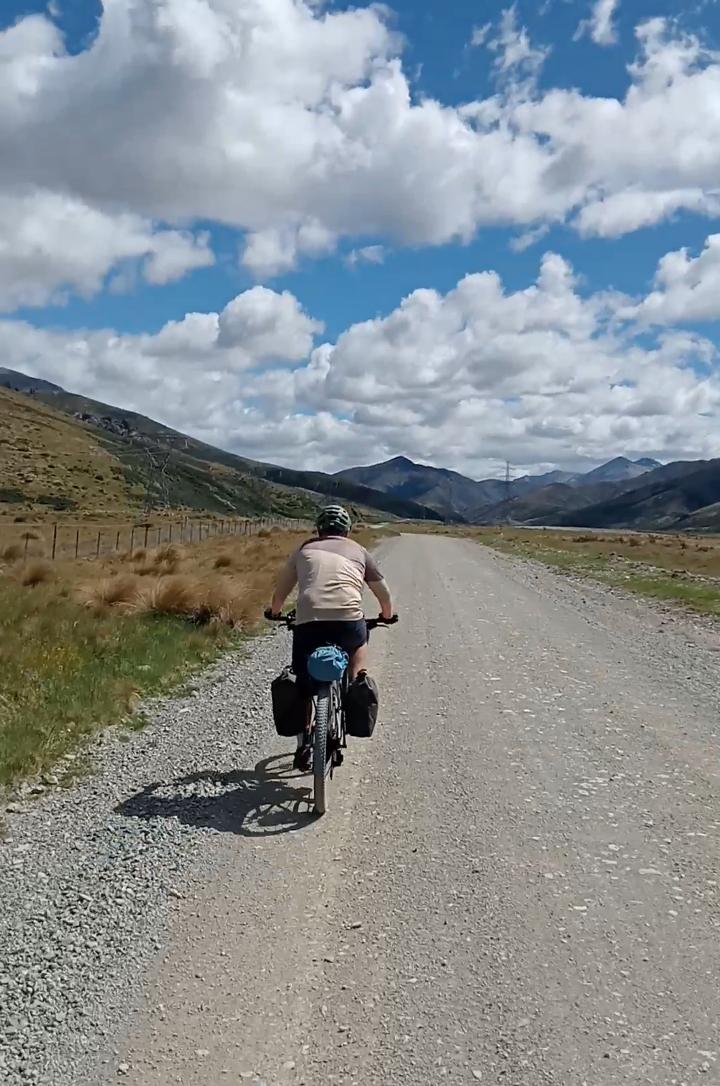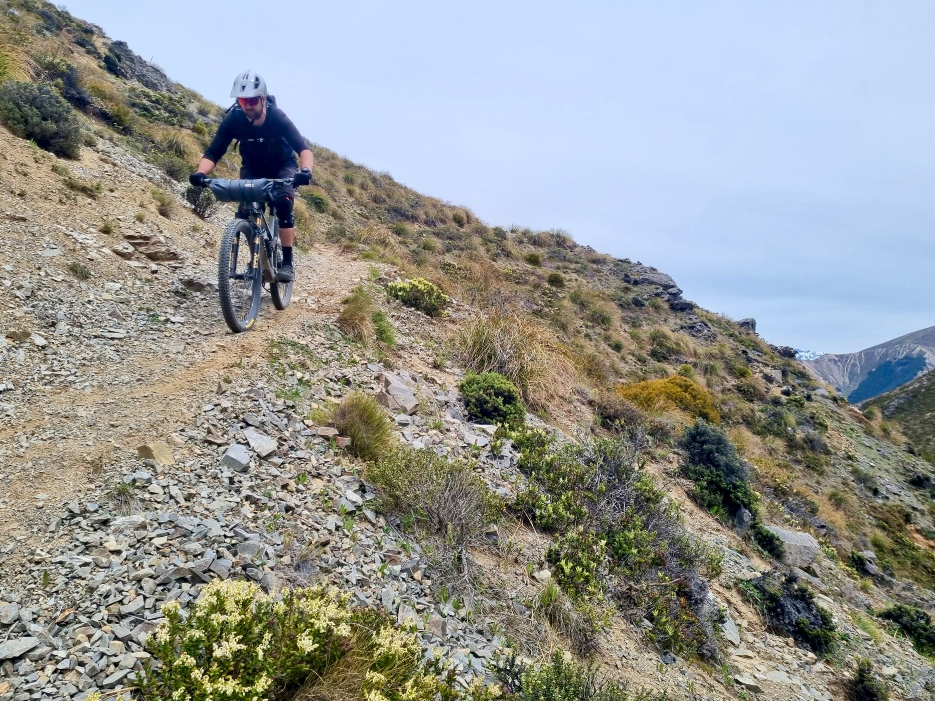 Soon, we reached Stanley Gates, where the river squeezes through a small gorge. A bypass route took us up through beech forest onto a bluffy face before descending on scree-like track back to the river. Next came the slog, more walking than biking up near Racecourse Stream, navigating water runoff before reaching the dry expanse of The Racecourse—a vast tussock flat locked between mountain ranges. Crossing it felt endless, pedalling over clumpy grass until we finally reached scrubby hills on the far side and looked back across the plain we had overcome.From there, we descended toward Charlies Saddle navigating a few sketchy spots while enjoying not having to do too much pedalling.