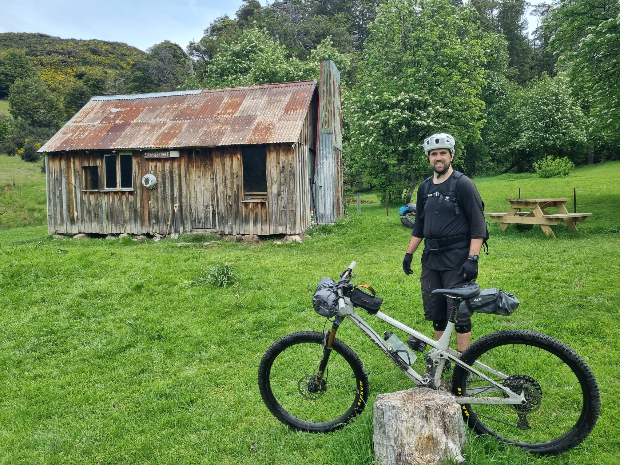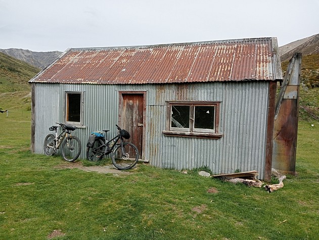 From atop Fowlers Pass, we dropped elevation quickly down the northern face on loose, exposed track, choosing to leave a couple of corners unridden rather than risk a crash with the addition of extra gear onboard, especially knowing we were a long way from a medical centre. Once down in the valley we undulated through beech forest and grassland, following Smyths Stream and crossing it multiple times before navigating through a smelly bog. Eventually, the valley opened up to reveal snow-capped mountains and our first destination: Stanley Vale Hut, an historic DOC hut dating back to the 1860s.