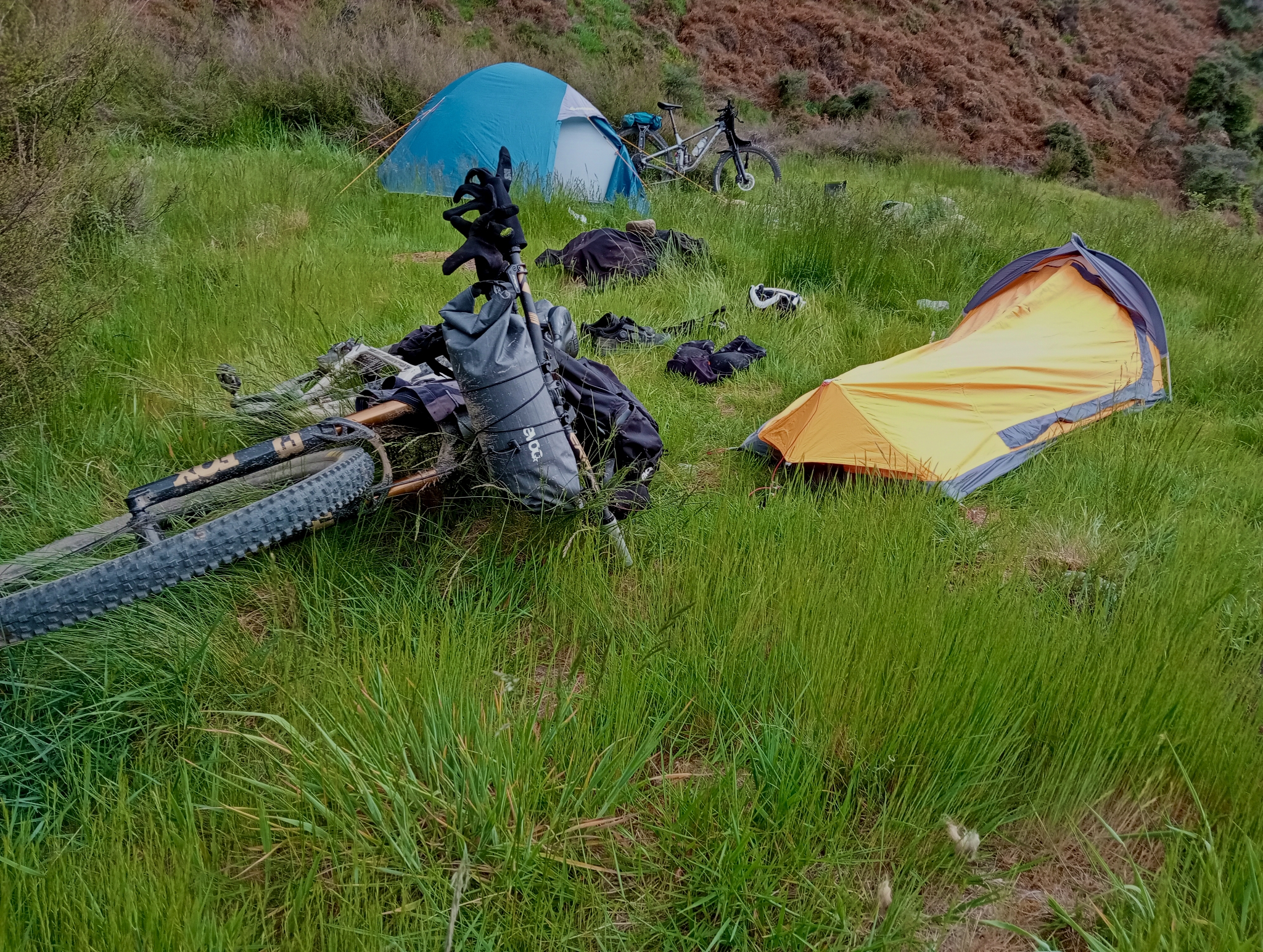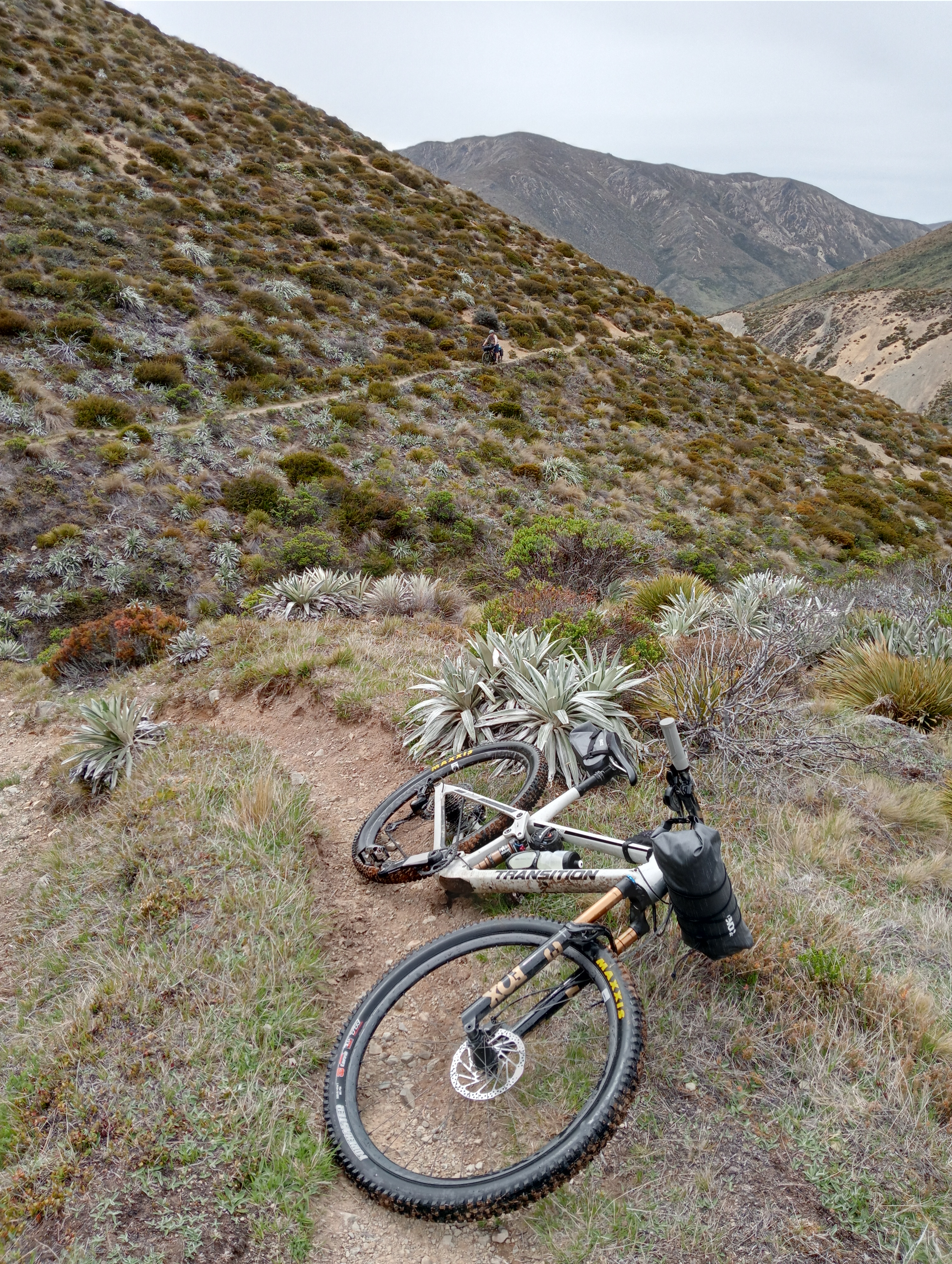 It all started with loading the bikes onto the car and heading a few hours north of Christchurch. The last stretch of road was bumpier than expected, resulting in the first tyre change of the trip—and it wasn’t the bike. After a quick wheel swap on the car, we loaded our bikes with gear. I opted for a minimalist setup using an EVOC handlebar and seat bag for camping essentials, with the rest in a backpack. Bevan on the other hand, turned his bike into a mule with Old Man Mountain racks and bags. With everything packed, we set off on the bikes, starting with a short push up a rough section of track before reaching established singletrack that wound its way up the pass. Along the way, we met a man on horseback accompanied by five dogs who was also heading into the backcountry.